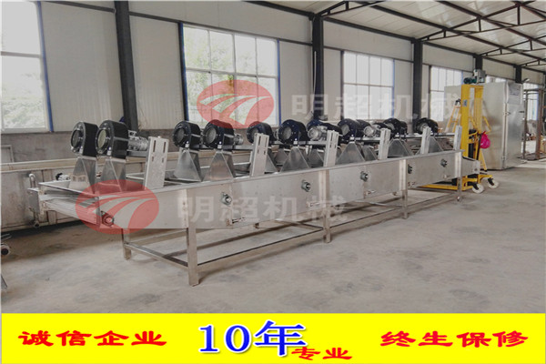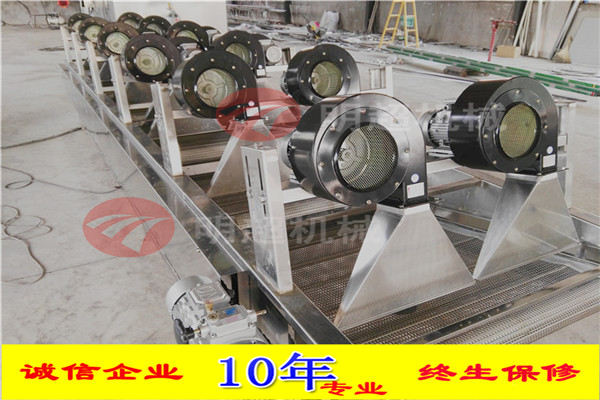 6.通過風(fēng)刀將自然風(fēng)轉(zhuǎn)換成強(qiáng)流風(fēng)。風(fēng)干機(jī)輸送網(wǎng)帶設(shè)計為多次翻轉(zhuǎn)輸送,確保產(chǎn)品兩面除水效果,風(fēng)干機(jī)吹干效果良好 設(shè)備采用變頻輸送,速度可調(diào)輸送平穩(wěn)。