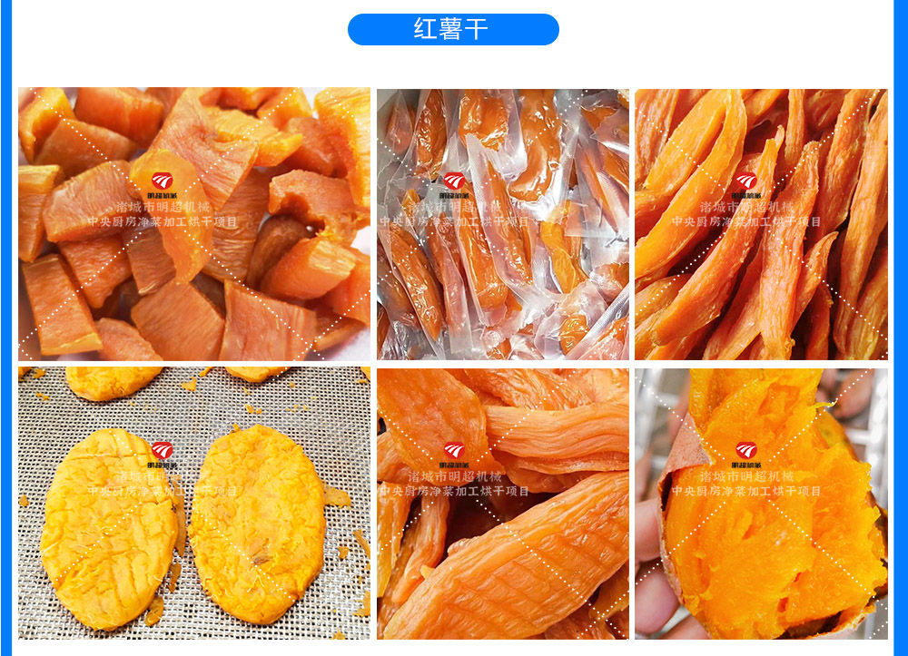 一,加工紅薯干所需要的設備有紅薯清洗機,紅薯蒸箱,紅薯切條機,紅薯切片機,紅薯切丁機,紅薯烘干房,袋式包裝設備,盒式包裝機等等,由于加工紅薯干的工藝不同,有做紅薯片的,有做紅薯條的,有做紅薯丁的,每個加工工藝不同,所用到的設備也是不同的,產量不同,要求不同,所配的設備型號,價格都不同,加工紅薯干的設備也可根據客戶的產量大小來確定用那幾款設備,這些我們公司技術工程師會為您一一解答。凡是跟諸城明超機械合作均可免費提供技術服務支持,享受一切特權。